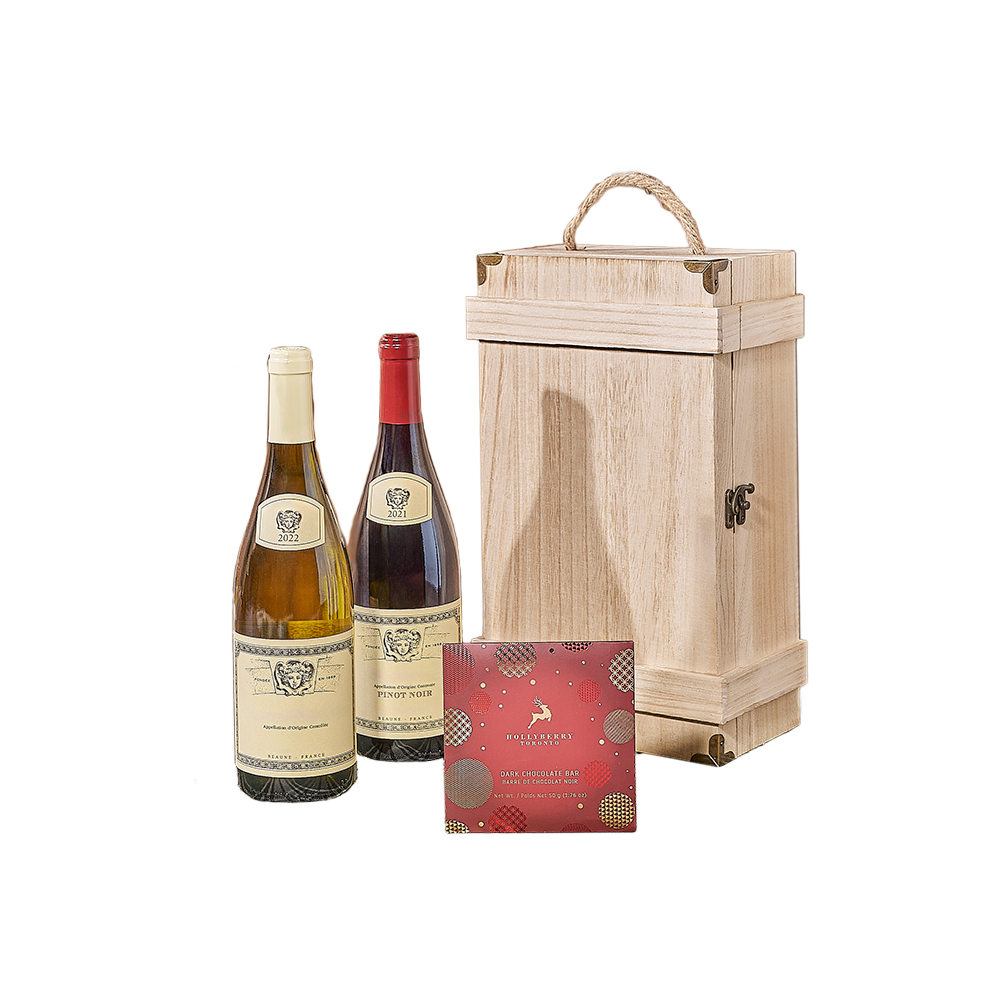 Delight the wine enthusiast on your holiday list with the Christmas Wine Duo gift set from Washington Baskets. Featuring two bottles of wine, a bar of dark chocolate bar, and a wooden gift box, it's a perfect blend of elegance and indulgence.